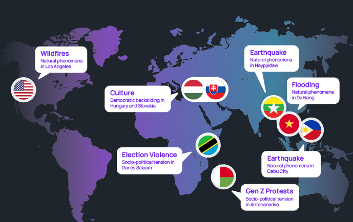 Youth-led demonstrations became a prominent feature across the world in 2025, reflecting growing political engagement (and dissatisfaction) among younger populations. These protests caused disruption and even additional danger for assignees in cities where violence occurred.