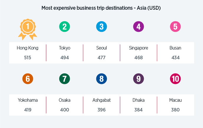 Hong Kong is the most expensive location in Asia for business travel, with the typical business trip costing USD 515 per day.